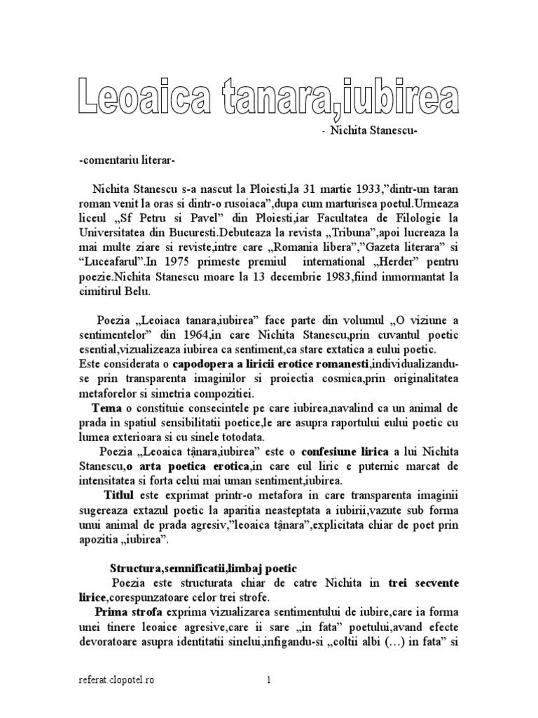 Doc Cantec De Nichita Stanescu Poezie Maio Andreea Academia Edu