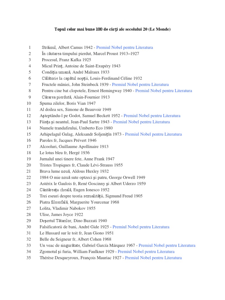 Cele Mai Frumoase 100 De Carti De Citit Intr O Viata