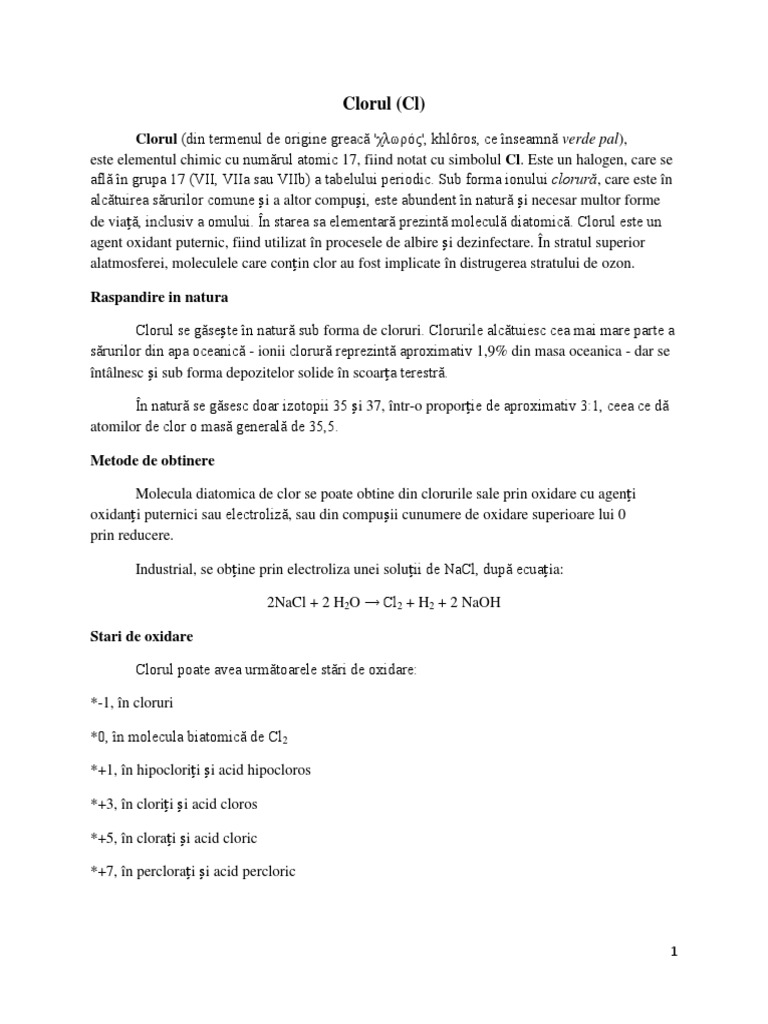 Clorul Este Utilizat Pentru Sterilizarea Apei Potabile Pentru Aceasta Se Barboteaza Cite 142 Grame Si Brainly Ro