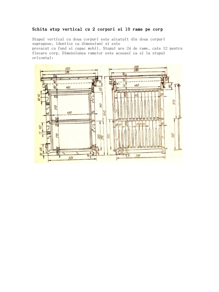 Dimensiuni stup dadant 10 rame. Solicit parerile voastre cu privire la dimensiuni. 20 00 ron adauga in cos. Intre soclu si rame 20 mm intre rame si peretele lateral 8 mm intre rame corp si rame magazin 10 mm intre rame magazin si podisor 10 mm. Stupi verticali 10 rame cu magazie podișor hrănitor și soclu anti varroa.