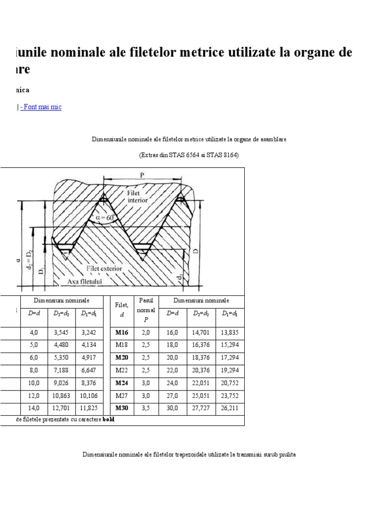 Dimensiunile Nominale Ale Filetelor Metrice Utilizate La Organe De Asamblare